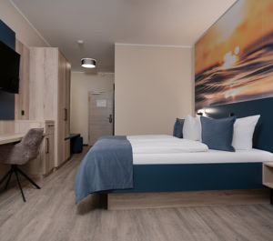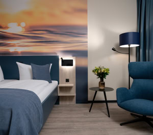 Die Doppelzimmer mit Balkon befinden sich in der 1. und 2. Etage und bieten Platz für maximal 2 Personen. Sie verfügen über ein Doppelbett (180 cm x 200 cm), sind mit TV, Zimmersafe, Minibar, Föhn, Kosmetikspiegel, Dusche & WC ausgestattet und bieten einen seitlichen Blick auf die Ostsee. Zwei der Zimmer verfügen über ein Schlafsofa und bieten Platz für maximal 2 Erwachsene und 2 Kinder oder 3 Erwachsene.